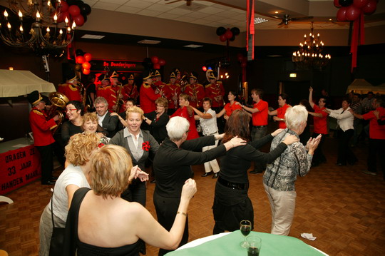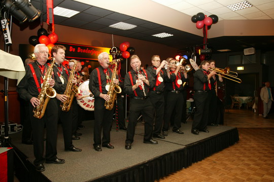 Op zaterdag 13 december moeten wij voorgoed afscheid nemen. Henk was al 33 jaar de bassist van onze kapel. Geen enkele repetitie of optreden sloeg hij over. Altijd was Henk opvallend on-opvallend aanwezig. Wij verliezen een fijn mens, goede muzikant en vriend. Wij wensen Marion en Ruud, Frank en de kleinkinderen veel sterkte toe in de komende tijd. De Donderjagers zullen verder moeten zonder bassist Henk. 03-12-2008 Sint op bezoekTot grote verrassing van De Donderjagers kwam vanavond tijdens de repetitie in De Knip Sint en Piet op bezoek.Sint memoreerde dat hij al heel oud was maar vroeg toch of de Donderjagers speciaal voor hem "Du kannst nicht immer siebzehn sein" wilde spelen. De inzet was moeilijk omdat Ton van de Burgt niet op de repetitie was. Waar hij was wisten we niet omdat hij zich niet afgemeld had. Daar moet de Sint hem het volgend jaar maar eens op aanspreken. Onder de klanken van "Dag Sinterklaasje" werd afscheid genomen van Sint en Piet. 03-11-2008 Bellebloasfestijn in SchijndelIn de Boerenhofstede in Schijndel hebben we deelgenomen aan het jaarlijkse blaasfestijn van de Bellebloazers uit Schijndel. Na het eerste optreden rond half vier hebben we genoten van vele kapellen en lekker gedronken en gekletst tot we het slotoptreden rond half acht voor onze rekening genomen hebben.14-10-2008 Weekend ValkenburgDe dames van De Donderjagers hadden in verband met ons 33 jarig jubileum een weekend naar Valkenburg georganiseerd. Vrijdag zijn we gestart met een heerlijke brunch in Nia Domo waarna we met de bus naar Hotel Walram in Valkenburg gegaan zijn. Daar aangekomen was het echt zonnig terrasjesweer en hebben lekker ingedronken.Onze kienjuffrouw was Helmondse Jet. Samen met Jeanne hielden ze de vaart er goed in. Tot onze grote verassing kwamen dansmariekes De Donderdurskes ons met een dansje vermaken. Een lust voor het oog, vooral voor Wim, en de beentjes vlogen nog aardig de lucht in. Als pikant einde van de dans gingen de rokjes omhoog en kwam de kant tevoorschijn. Bij het volgende optreden trok Joke er met haar accordeon in de gedaante van Manke Nelis lekker op los en bracht de stemming er helemaal goed in. Trut de vrouw van Driekske bracht een buut waar Driekse zijn vingers aan af kan likken. Alle Donderjagers werden flink op de korrel genomen. Als slot van de kienavond klonk luidkeels het Donderjagers - alfabet - lied "Donderjagers hier en Donderjagers daar, Ze maken muziek, ja al 33 jaar" uit de kelen van alle dames. Ton kwam heel blij als beste kiener met de meeste rommel uit de bus en kon al die rotzooi mee naar huis nemen. Tot in de kleine uurtjes werd in de bar van het hotel nog nagekaart over de avond en vloeide de drank rijkelijk. Op zaterdag hebben we met de huifkar een bezoek gebracht aan de Gulpener bierbrouwerij, lekker geluncht in Valkenburg, de Steenkolenmijn in Valkenburg bezocht, genoten van het zonnetje op een terras en weer heerlijk gedineerd. 's Avonds hebben we opgetreden in Le Baroque en weer nagekaart tot in de late uurtjes in de bar van het hotel. Op zondag hebben we opgetreden op de Bokkemert en zijn daarna huiswaarts gekeerd. Bij 't Menneke hebben we nog een afzakkertje genomen. De Donderjagers zijn door de dames met een geweldig weekend voor hun 33 jarig Jubileum gehuldigd. Dames, kusjes en hardstikke bedankt. 02-10-2008 De Donderjagers op de barbecue bij De OpdondersBij ons 33 jarig jubileumfeest hebben we van De Opdonders een barbecue aangeboden gekregen. Afgelopen zondag was het zo ver en togen we met z'n allen, De Donderjagers, onze dames en kinderen naar de Wielewaallaan waar we een heel goed verzorgd feest aantroffen. De Opdonders hadden niets aan het toeval overgelaten en ook het zonnetje liet ons niet in de steek. Een geweldig gezellig samenzijn waar lekker gegeten en gedronken werd en waar weer heel wat sterke verhalen naar boven kwamen.De Opdonders hebben ons nog een muzikale serenade gegeven wat afgesloten werd met een "Lang Zullen Ze Leven" en een driemalig alaaf. Hardstikke leuk dat Jan Swinkels voor zijn jarenlange inspanningen voor de Opdonders ook nog in het zonnetje gezet werd. 08-09-2008 Grandioos Jubileumfeest 33 Jaar De DonderjagersAfgelopen zondag hebben we ons 33 jarig bestaan grandioos gevierd in de mooi versierde Koepelzaal van Nia Domo. Alle optredende kapellen, De Donderslagen, De Mertplekkers, De Opdonders, Ok Moi, De Dweilers, De Bellebloazers en de Ganzendonckse Hofkapel hebben hun beste muzikale beentje voor gezet. Vele vrienden van de Donderjagers hebben ons met een bezoek vereerd. Te veel om allemaal op te noemen.Er waren op deze dag veel hoogtepunten. Allereerst waren we blij verrast met de spitsvondige toespraak van Joep van 't Menneke en kregen we van Joep een echt Menneke aangeboden. ![]() ![]() Het volgende hoogtepunt was de installatie van de nieuwe Dassendragers van De Donderjagers. In het bijzijn van vele Dassendragers van De Donderjagers werd Jo van Duren officieel met Das en Oorkonde geïnstalleerd. Jo heeft zijn opleiding van een Donderjager gehad, heeft ons vaak tijdens de carnaval uit de nood geholpen als er een Donderjager niet meer in staat was om nog mee te spelen en het is een "dikke" vriend van alle Donderjagers. Dus terecht dat je dan Dassendrager wordt. Jo proficiat. Ter afsluiting hebben we als Harmonie H&D de nieuwe carnavalskraker "Uit Boekel kumt de muziek" nog eens laten horen. Daarna ontstond er nog een grote gezellige polonaise. Met het gedonder van ons kan dat ook niet anders. Een speciaal woord van dank aan de presentator van het Jubileumfeest Mario van Dinther. Mario het was subliem. ![]() ![]() Wij willen iedereen die er voor ons een onvergetelijke dag van gemaakt heeft hardstikke bedanken.01-09-2008 Programma Jubileumfeest 33 JAAR DE DONDERJAGERSHet Jubileumfeest wordt gehouden op 7 september van 11 tot 5 uur in Nia Domo te Boekel en gepresenteerd door Mario van Dinther.PROGRAMMA: 11.11 uur : Opening 16-08-2008 Rick en Mirelle gelukkige ouders