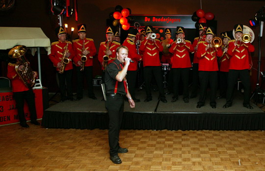Namens De Donderjagers feliciteren wij Martien en Sjan met hun kleindochter. 30-04-2008 De Donderjagers brengen serenade aan hun trompettist Martien24-04-2008 CD opname goed verlopenWij danken Peter en Tina van Uden van La Compagnie voor het beschikbaar stellen van de zaal. De zaal was perfect geschikt voor de opnamen. 21-04-2008 Rund um DürenDe organisatie had voor ons alles geweldig geregeld, viel Bier, Bröttchen und Wurst. De dames zijn ook niets tekort gekomen. Het was een goede repetitie voor de CD opnamen morgen en woensdag. 17-04-2008 Opname derde CD van de DonderjagersDe tweede CD, On Plukt, is opgenomen in 1996, dus werd het weer de hoogste tijd voor een nieuwe. De naam van de CD is natuurlijk nog een verassing. De CD zal 7 september gepresenteerd worden op het jubileum feest in Nia Domo. 30-03-2008 NaPaosBlaos 2008 Nistelrode28-01-2008 Pronkzittingen 2008, Harmonie H&D33 jaar de Donderjagers dat verdient een serenade. Knapper als ooit tevoren zaten de Donderjagers in hun bak en ze waren erg blij verrast toen Harmonie H&D de zaal kwam binnen gemarcheerd. Deze Harmonie kwam een serenade brengen aan de jubilerende Donderjagers met de nieuwe carnavalskraker "Uut Boekel kumt de muziek". De zang van Trudy, de vrouw van Driekske, werkte goed op de lachspieren. De zaal zong alle avonden erg fanatiek mee en de tekst van het refrein is dan ook zeer terecht "In dit prachtige Boekelse land, is iedereen muzikant" Klik op deze link om de Video van Harmonie H&D te zien 15-01-08 Prinsenreceptie 200806-01-2008 33ste seizoen van de Donderjagers, nieuwe kleding06-01-2008 33 jarig bestaan de DonderjagersWij zijn al druk bezig met het organiseren van het 33-jarig bestaan. Het evenement zal plaatsvinden in Nia Domo op zondagmiddag 7 septemberNoteer deze datum alvast in uw agenda.U kunt er de komende maanden meer over lezen op deze site. |